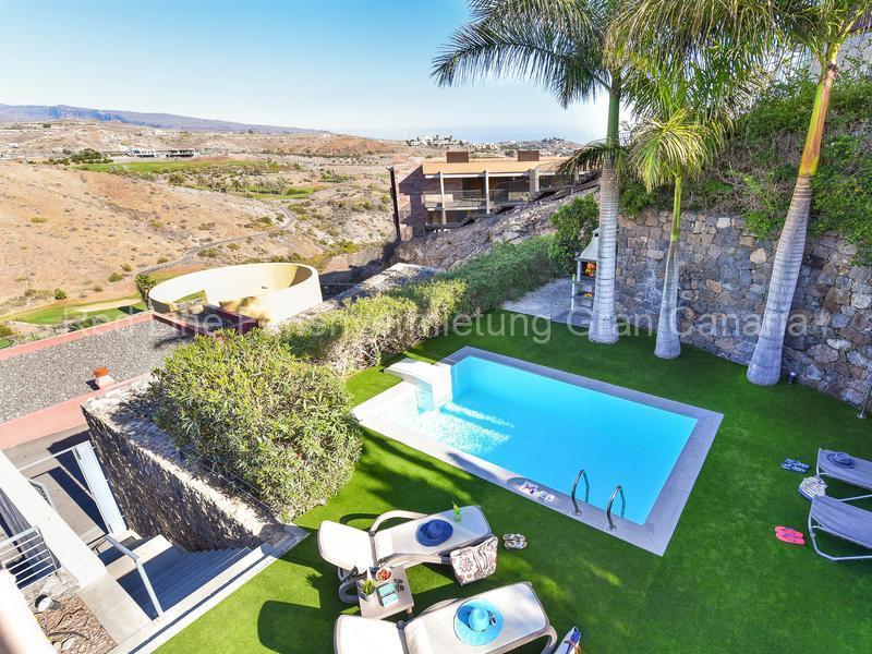 Modernes Ferienhaus mit Privatpool (beheizbar) und 2-Etagen sowie schöner Aussicht am Salobre Golf Resort im Süden von Gran Canaria. Gelegen an einem der Hänge des Salobre Golf Green genießen Sie von der Terrasse aus eine tolle Aussicht auf den Golfclub und die Berge im Südwesten der Insel. Die grüne Landschaft, die das Salobre Golf Resort umgibt, ist ideal um im Urlaub zur Ruhe zu kommen, die hin und wieder nur durch Vogelgezwitscher unterbrochen wird.