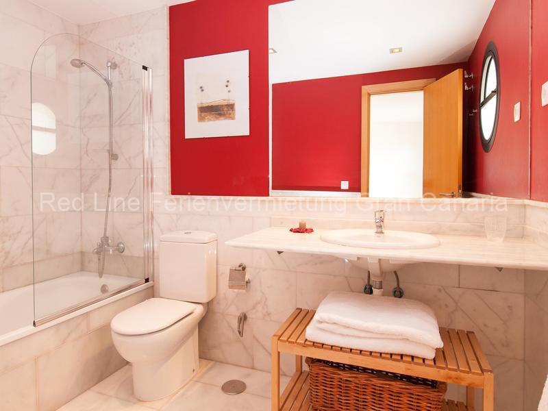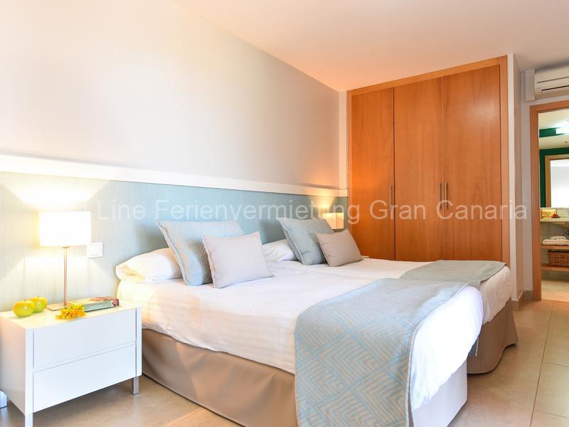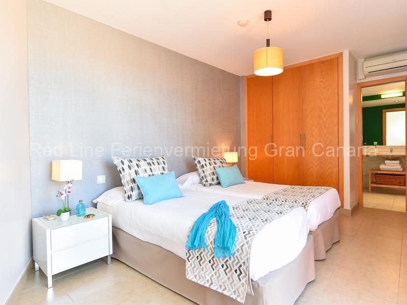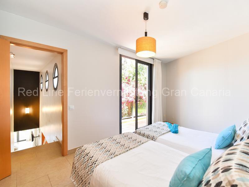 Das 4 Personen Haus hat  2 Schlafzimmer und 2 Bäder. Das Schlafzimmer mit zwei Einzelbetten hat Zugang zum Garten und zum Pool und befindet sich in der unteren Etage. Das 2. Schlafzimmr ist in der oberen Etage und hat Zugang zum Solarium und der Superior-Terrasse. Zu beiden Schlafzimmer gibt es ein Badezimmer mit Badewanne, große Kleiderschränken und Klimaanlage / Heizung.